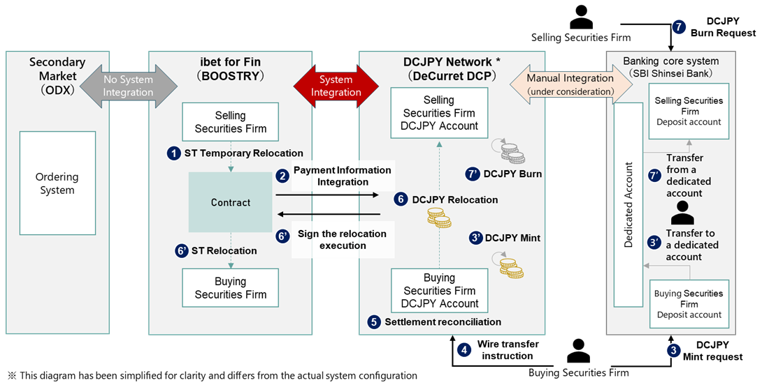 SBI SECURITIES Co.,Ltd. (President: Masato Takamura, hereinafter “SBI Securities”), Daiwa Securities Co.Ltd. (President and CEO: Akihiko Ogino, hereinafter “Daiwa Securities”), SBI Shinsei Bank, Limited (Representative Director, President: Katsuya Kawashima, hereinafter “SBI Shinsei Bank”), BOOSTRY Co., Ltd. (President and CEO: Kazuma Hirai, hereinafter ‘BOOSTRY’), Osaka Digital Exchange Co., Ltd. (Representative Director & President: Kimio Mikazuki, hereinafter “ODX”), DeCurret DCP Inc.(Representative Director, Chairman and President: Satoshi Murabayashi, hereinafter “DeCurret DCP”) have commenced collaboration on a proof-of-concept (hereinafter “this project”) for DVP2 settlement of security tokens (hereinafter ‘ST’) using tokenized deposits DCJPY (hereinafter “DCJPY”). This aims to realize a new settlement scheme for the development of the secondary market for security tokens. Project participants conducted verification of DVP settlement for ST and DCJPY using test data in August 2025, largely completing the system design and operational workflow for DVP settlement as envisioned for secondary ST trading. Moving forward, they will proceed with verification using actual issuance of ST and DCJPY.