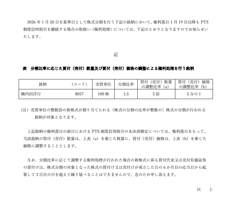 Treatment of Rights due to Stock Splits in PTS Standardized Margin Trading(JA)
