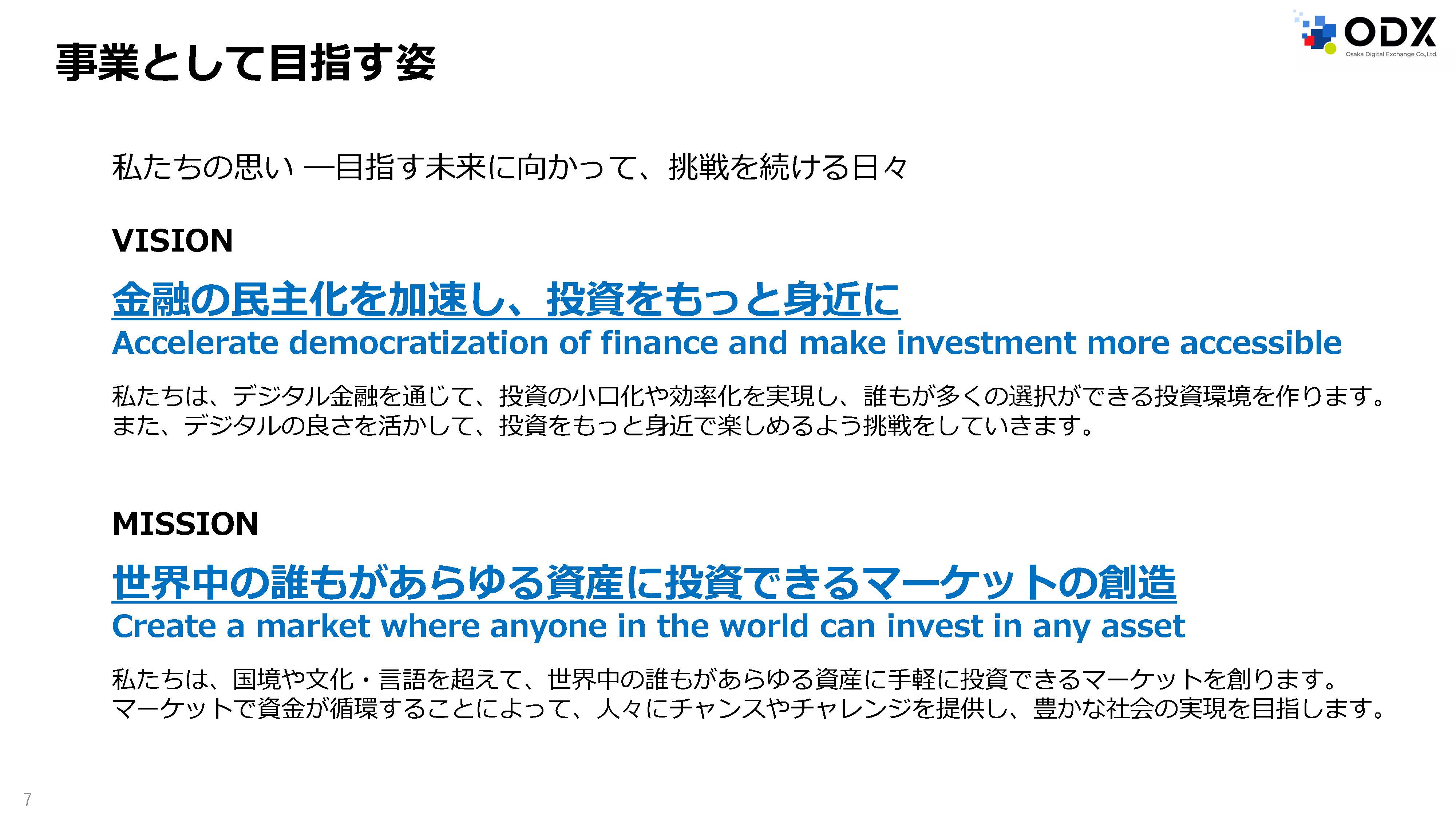 長い間培われてきた金融システムが、デジタルを主軸に置くことで、「投資の小口化」や「資金調達の多様化」など、金融の民主化が加速され、歴史を変革する無限の可能性があります。